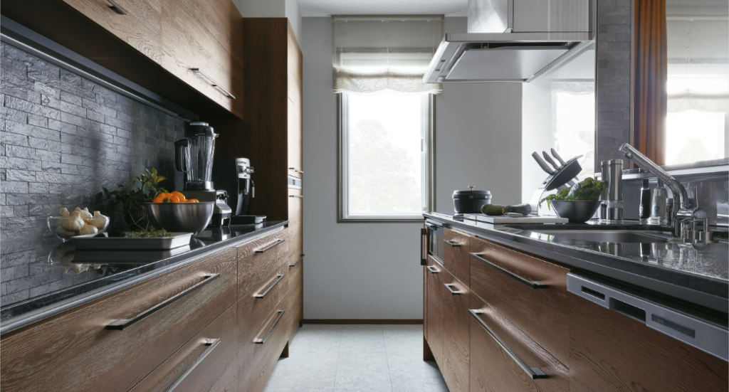グレイスキッチンは、一条工務店が展開するキッチンの中で最も高級感を備えたシリーズ。木目の柄と木本来の凹凸感を一致させた「グレイステクスチャー」を採用しており、上質な雰囲気を纏っています。